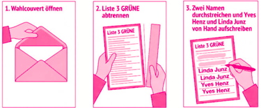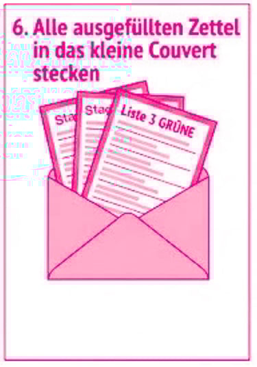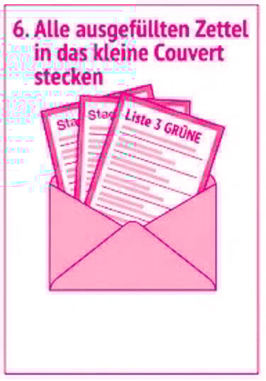 6. Lege alle ausgefüllten Zettel (Gemeinderat, Stadtrat, Stadtpräsidium, Abstimmungen) in das kleine Stimmkuvert.