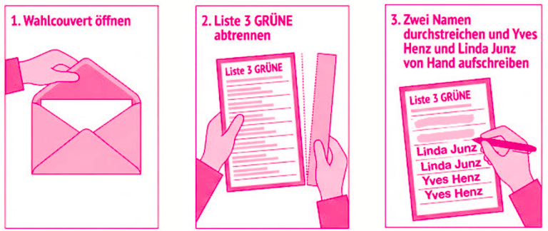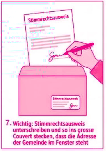 Ganz wichtig: Unterschreibe den Stimmrechtsausweis im markierten Feld. Ohne Unterschrift ist deine Stimme ungültig. Lege den unterschriebenen Ausweis so in das grosse Antwortcouvert, dass die Adresse des Wahlbüros im Fenster sichtbar ist.